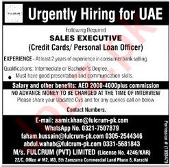 Vacant posts including sales executive are announced in Fulcrum Pvt Ltd Abu Dhabi, abu dhabi UAE as per 1 September 2024 advertisement in daily Jang Newspaper. Educational qualifications required Bachelor and Intermediate etc.