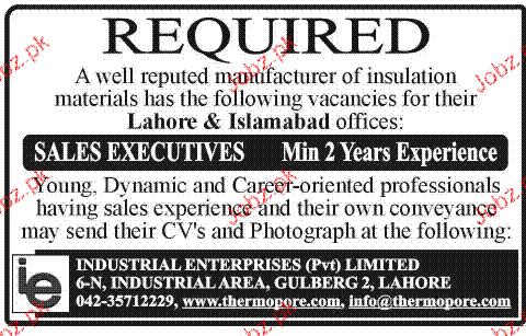 Sales Executives are required in Industrial Enterprises Pvt ltd in Lahore
