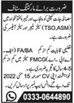 Food Company jobs advertisement dated about 17 April 2022 in daily Jang Newspaper invites application for the vacant post of assistant sales manager asm and telesales officer tso in Lahore, peshawar and lahore Punjab Pakistan. Persons with BA and Intermediate etc. education can apply.