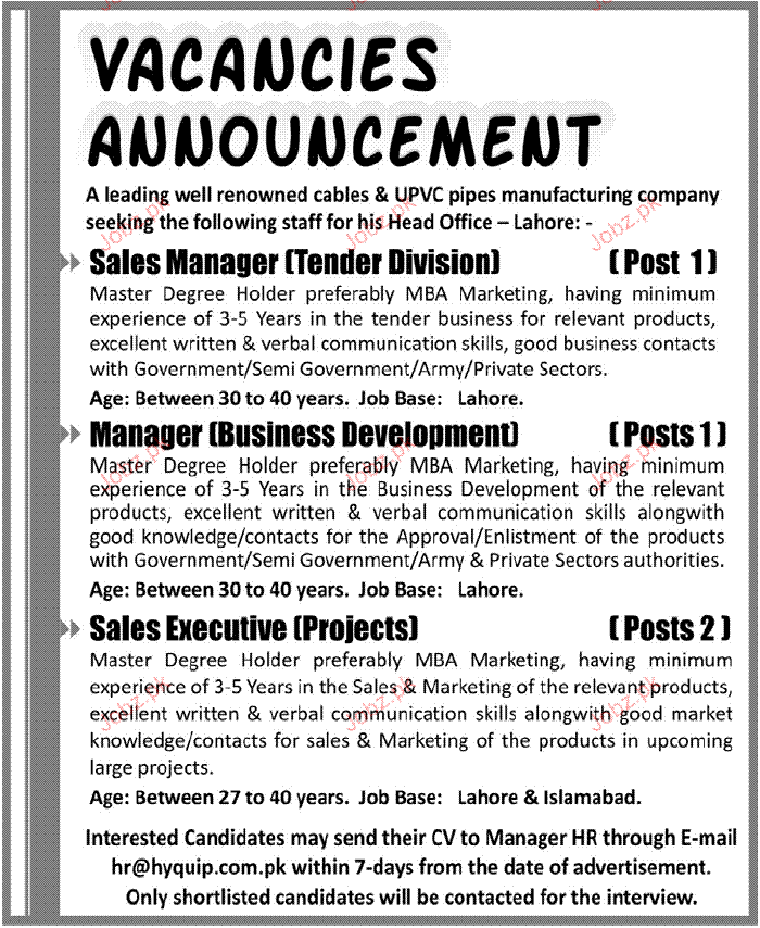 Apply as per details in job advertisement. Login to view further details of how to apply via https://www.jobz.pk online.