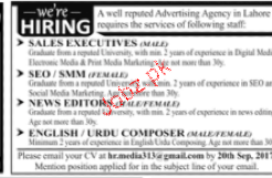 Sales Manager, Sales Executives , News Editors and Composers are required in Lahore. Qualified and Experienced Candidate Send their CV Along with All necessary Documents.