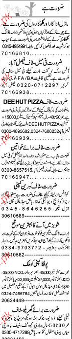 Sales Manager, Sales Officers, Salesmen, Cook, Chef, Models and Artists are required in Lahore. Send your Application with all Education certificates, Photographs, Domicile and copy of CNIC.