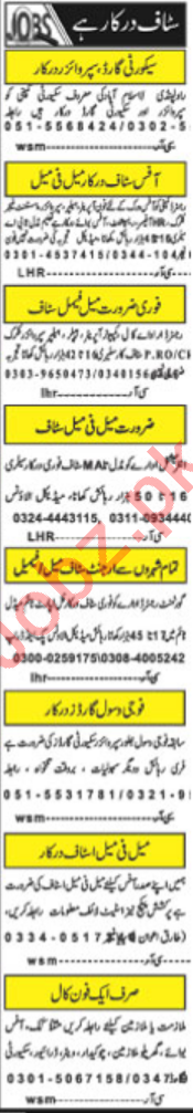 Sales Officer, Cook, Security Guard, Watchman, Driver, Kitchen Helper, Dish Washer, Loader, Waiter, Receptionist, Supervisor, Chef, Maid, Assistant Nurse, LHV, OT Technician, Public Dealing Expert, Office Assistant, Clerk, Admin Officer, Data Entry Operator requires in well known companies.