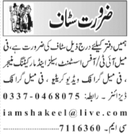 Private Company is looking for candidates for following posts as per job advertisement published in daily Jang Newspaper of April 18, 2022 for location Lahore, lahore Punjab Pakistan: