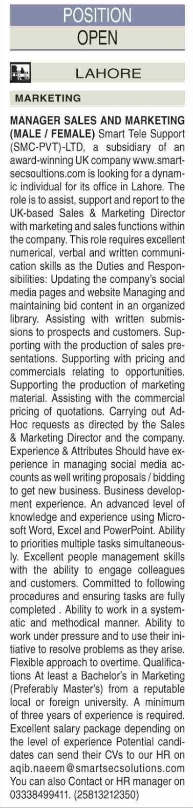 Sales Marketing Manager Jobs At Smart Tele Support Limited
