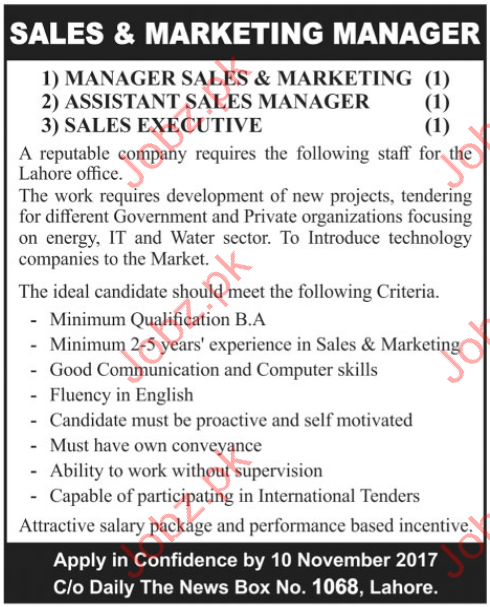 Sales & Marketing Managers Jobs In Lahore 2017