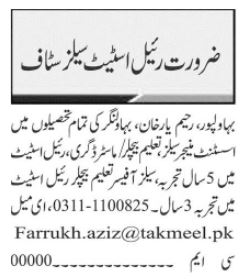 Latest Classifieds jobs in Takmeel Square in Real Estate and others can be applied till 15 June 2024 or as per closing date in newspaper ad. Read complete ad online to know how to apply on latest Takmeel Square job opportunities. Learn today skills like Sales Promotion, Sales Management and Real Estate Management to apply confidently on these Takmeel Square jobs.