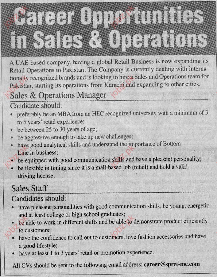 Sales & Operations Manager And Sales Staff Job Opportunity