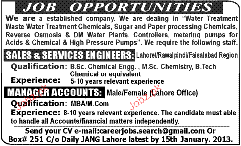 Sales & Service Engineers and Manager Accounts Required