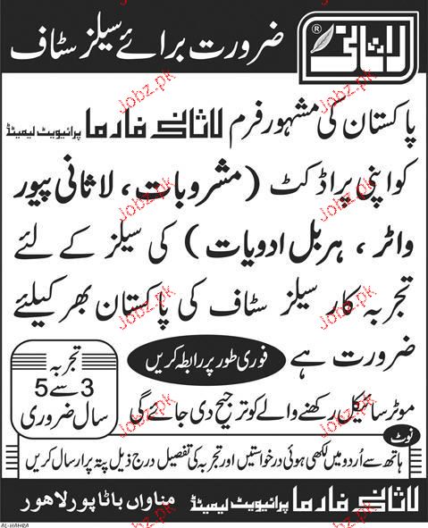 Sales Staff required in Lasani Pharma Pvt Ltd in Lahore.