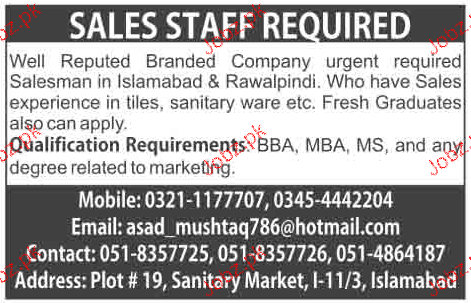 Latest Private Company Sales Posts Islamabad 2025