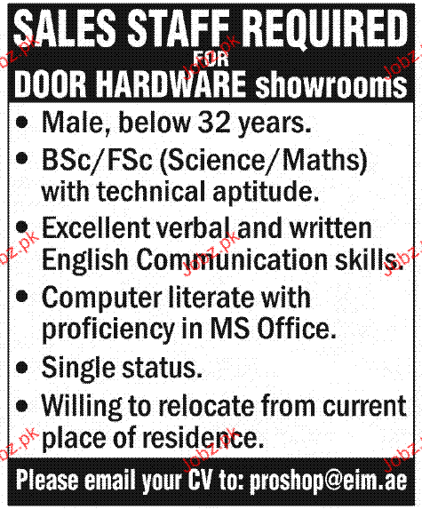 Sales Staff required in Door Hardware Showrooms in Lahore