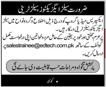 Express Media Group jobs advertisement dated about 11 April 2022 in daily Express Newspaper invites application for the vacant post of sales trainee and sales executive in Quetta, quetta Balochistan Pakistan. Persons with Bachelor etc. education can apply.