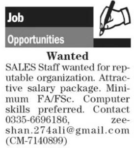 Private Company jobs advertisement dated about 13 December 2023 in daily The News Newspaper invites application for the vacant post of salesman and sales officer in Lahore, lahore Punjab Pakistan. Preferred Education is Intermediate etc.