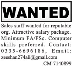 Sales Staff & Sales Officer Jobs 2024 In Lahore