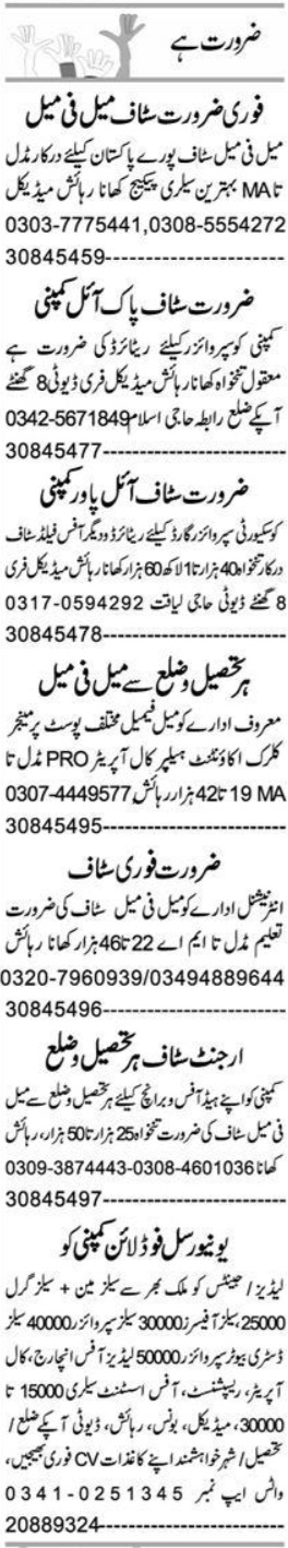 Private Peshawar, peshawar Khyber Pakhtunkhwa KPK Pakistan invites applications from eligible candidates for the post of office staff, ladies office incharge, supervisor, security supervisor, office assistant, retired staff, sales officer, receptionist, manager, clerk, salesman, management staff, male female staff, sales supervisor, field staff, security guard, pro, helper, accountant, sales distributor supervisor, call operator and sales girl as per advertisement of March 8, 2023 published in daily Express Newspaper. Candidates with Matric, Bachelor, Intermediate, Master and Middle etc. educational background will be preferred.