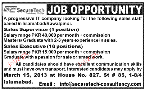 Latest Private Company Sales Posts Islamabad 2025