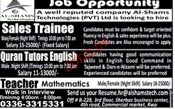 Sales Trainees And Quran Teachers Job Opportunity