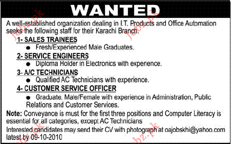 Sales Trainees, Services Engineer, Customer Officer Vacancy