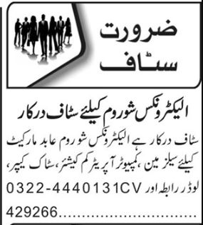 Electronics Showroom is looking for candidates for following posts as per job advertisement published in daily Roznama 92 News Newspaper of July 30, 2024 for location Lahore, lahore Punjab Pakistan: