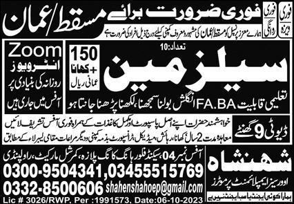 Shahensha Overseas Employment Promoters jobs advertisement dated about 19 October 2023 in daily Express Newspaper invites application for the vacant post of salesman in Muscat, muscat Oman. Persons with BA, Bachelor and Intermediate etc. education can apply.