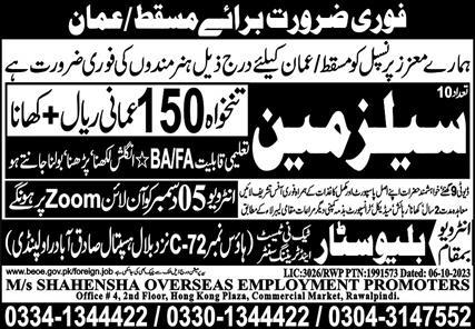 Blue Star Techni Test & Training Center Muscat, muscat Oman invites applications from eligible candidates for the post of salesman as per advertisement of December 5, 2023 published in daily Express Newspaper. BA, Bachelor and Intermediate etc. educational qualification will be preferred.