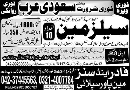 Father & Sons Manpower Supply invites applications for job positions advertised in daily Express dated 3 July 2024 for following vacancies in Riyadh, dammam Saudi Arabia.