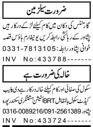 Private Company Peshawar, peshawar Khyber Pakhtunkhwa KPK Pakistan invites applications from eligible candidates for the post of salesman, sales staff and khala as per advertisement of August 21, 2024 published in daily Aaj Newspaper. Persons with Intermediate, Matric and Middle etc. education can apply.