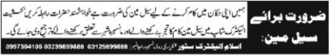 Islam Electric Store invites applications for job positions advertised in daily Shamal dated 29 March 2022 for following vacancies in Mansehra, mansehra Khyber Pakhtunkhwa KPK Pakistan.