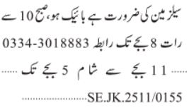 Vacant posts including salesman and sales staff are announced in Marketing Company Karachi, karachi Sindh Pakistan as per 10 December 2025 advertisement in daily Jang Newspaper. Educational qualifications required Bachelor, Matric and Intermediate etc.