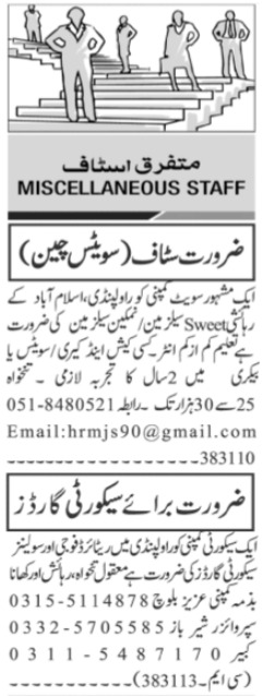 Private Company Islamabad, rawalpindi Islamabad Pakistan invites applications from eligible candidates for the post of security guard, civilian guard, salesman and fauji guard as per advertisement of April 17, 2024 published in daily Jang Newspaper. Candidates with Matric, Middle and Intermediate etc. educational background will be preferred.