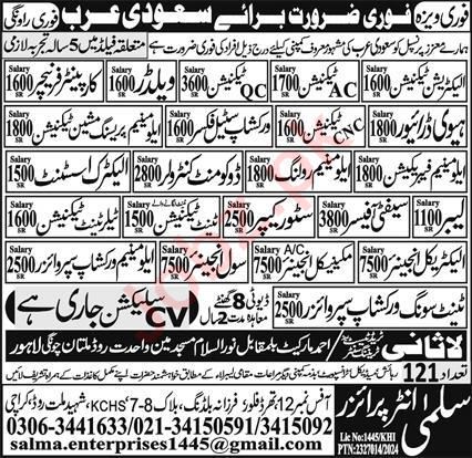 Salma Enterprises jobs advertisement dated about 11 February 2024 in daily Express Newspaper invites application for the vacant post of Tent Technician, Ac Technician, Civil Engineer, Qc Technician, Aluminium Pressing Machine Technician, Tent Sewing Workshop Supervisor, Electric Assistant, Safety Officer, Document Controller, Store Keeper, Welder, Cnc Technician, Aluminium Fabrication, Aluminium Workshop Supervisor, Workshop Steel Fixer, Mechanical Engineer, Labor, Carpenter Furniture, Heavy Driver, Aluminium Rolling, Electrical Engineer, Electrician Technician and Tailor Tent Technician in Riyadh, riyadh Saudi Arabia. Educational qualifications required Primary, Intermediate, Middle and Matric etc.