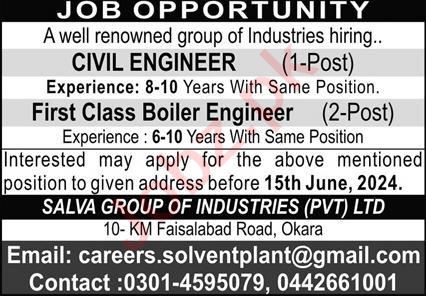 Salva Group of Industries jobs advertisement dated about 9 June 2024 in daily Express Newspaper invites application for the vacant post of first class boiler engineer and civil engineer in Okara, okara Punjab Pakistan. Candidates with Bachelor etc. educational background will be preferred.