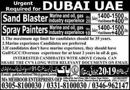 Ms Mehboob Enterprises is looking for candidates for following posts as per job advertisement published in daily Express Newspaper of July 17, 2023 for location UAE, dubai UAE: