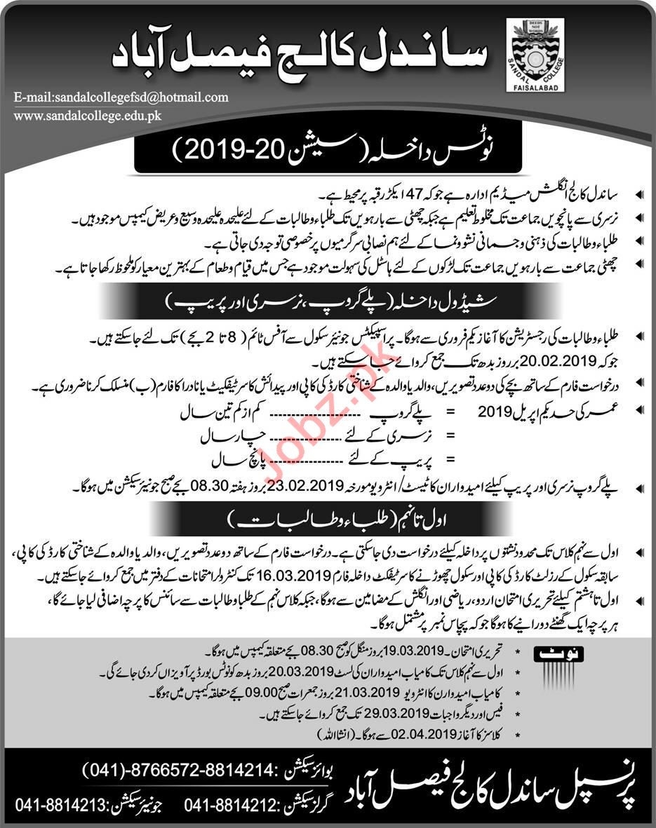 Sandal College Faisalabad, Pakistan are announced admissions spring 2019 for the classes of Play Group, Prep, Nursery, Class 1 to Class 9. Last Date of Submission of Application Form March 16, 2019 Read newspaper ad for exact details.