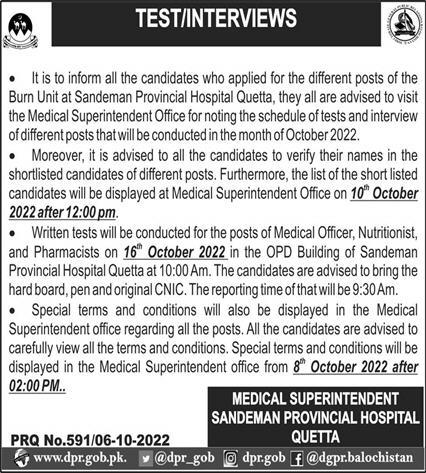 Sandeman Provincial Hospital Quetta Jobs Interview 2022