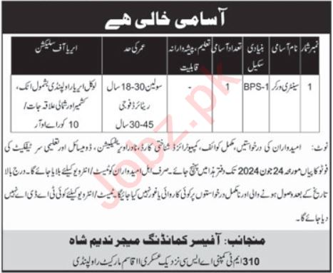 Pakistan Army Rawalpindi, rawalpindi Punjab Pakistan invites applications from eligible candidates for the post of sanitary worker as per advertisement of May 27, 2024 published in daily Ausaf Newspaper. Candidates with Primary etc. educational background will be preferred.
