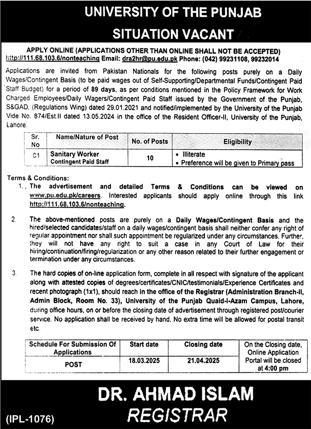 Latest Labor jobs and others Government jobs in University Of The Punjab PU closing date is around April 21, 2025, see exact from ad. Read complete ad online to know how to apply on latest University Of The Punjab PU job opportunities.