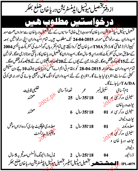 Sanitary Workers are required in Tehsile Municipal Administration in Bhakkar.