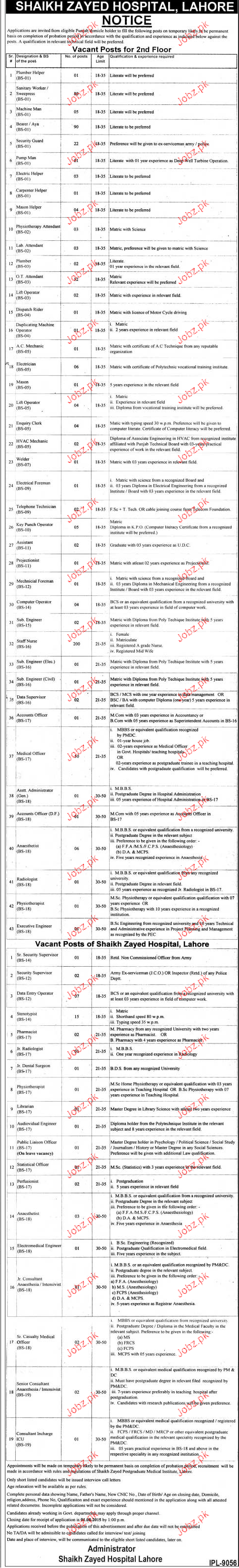 Sanitary Workers, Machineman, Security Guards, Pump Man, Electric Helpers, Mason Helpers, Plumbers, Lab Attendants, OT Attendants, AC Mechanics, Mason, Inquiry Clerks, Lift Operators, Projectionist, Assistant and Key Punch Operators are required in Shaikh Zayed Hospital in Lahore.