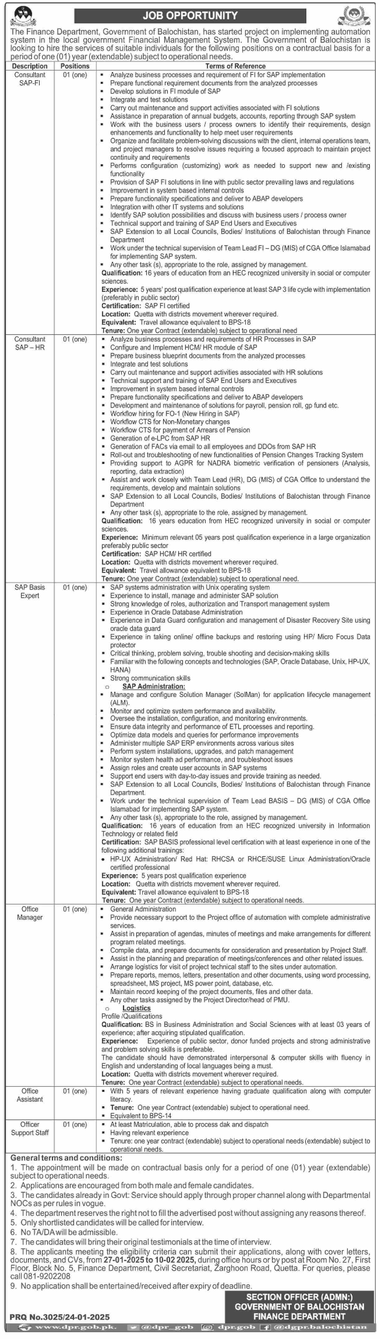 Finance Department is looking for candidates for following posts as per job advertisement published in daily Dawn Newspaper of January 25, 2025 for location Quetta, quetta Balochistan Pakistan: