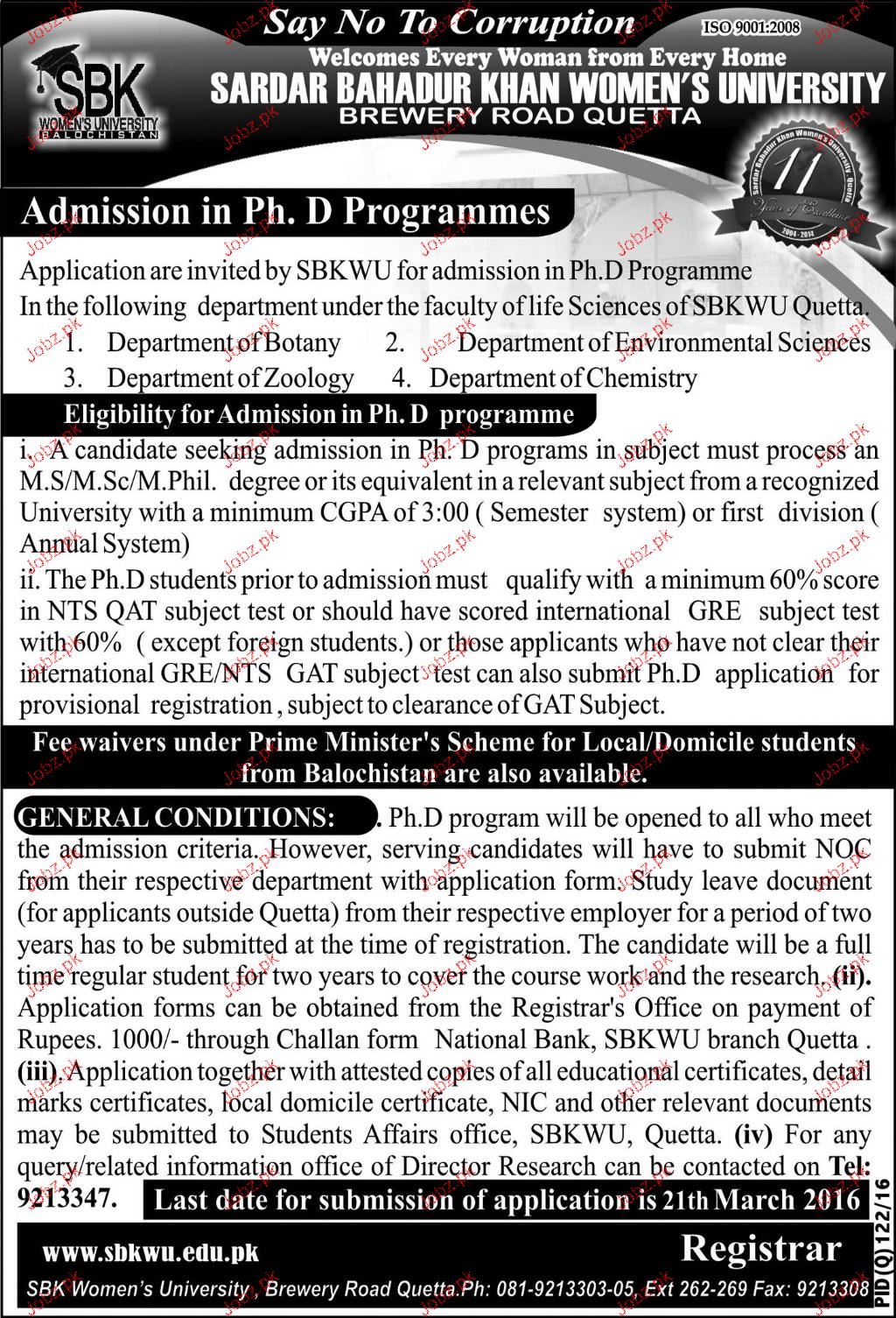 Sardar Bahadur Khan Women's University Admission in Phd in Quetta. Read newspaper ad for exact details.