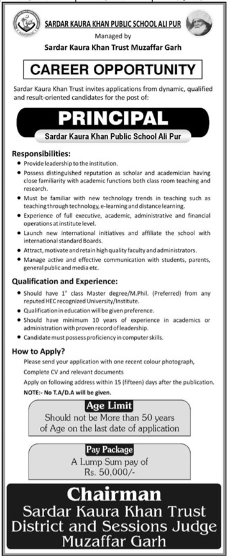 Sardar Kaura Khan Public School Job 2020 For Principal