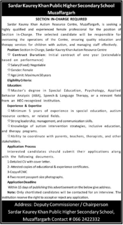 Sardar Kaurey Khan Public Higher Secondary School Muzaffargarh, muzaffargarh Punjab Pakistan invites applications from eligible candidates for the post of section incharge and female section incharge as per advertisement of June 13, 2025 published in daily Khabrain Newspaper. Preferred Education is Master etc.