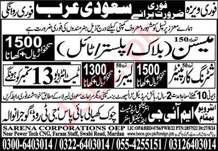 Sarena Corporations OEP is looking for candidates for following posts as per job advertisement published in daily Express Newspaper of September 9, 2024 for location Riyadh, riyadh Saudi Arabia: