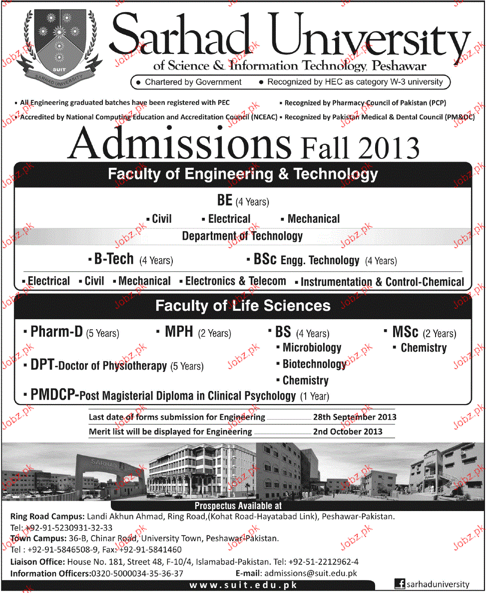 Sarhad Universitry of Science and Information Technology Engineering, Pharm-D and MSc in Peshawar Read newspaper ad for exact details.