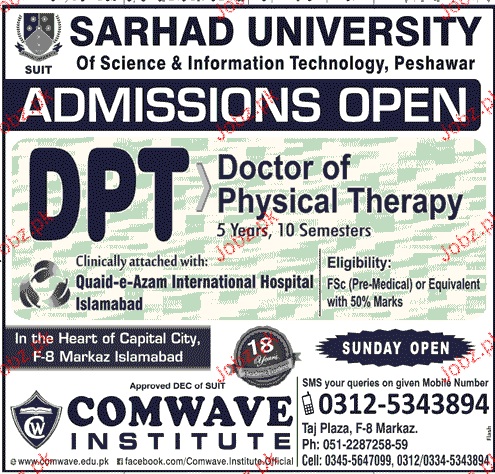 Sarhad University Admission in DPT in Peshawar. Read newspaper ad for exact details.