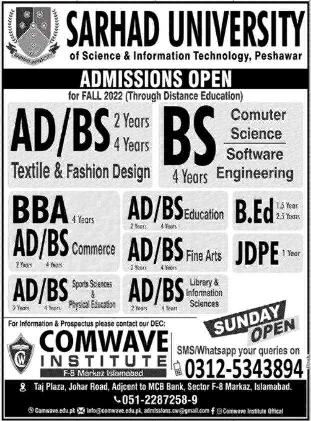 Sarhad University of Science & Information Technology AD BS Textile and Fashion Design, BS in Computer Science Software Engineering. BBA, B.Ed, JDPE. admissions 2022 has been announced. Eligible students who qualify as per admission criteria in Sarhad University of Science & Information Technology Peshawar Khyber Pakhtunkhwa KPK Pakistan can apply in Teaching University for academic year 2022. Eligible students for fulfilling criteria for admissions in B.ed, BS and Bachelor can enroll as per Private admission policy 2022 till closing date 31 October 2022. Read newspaper ad for exact details.