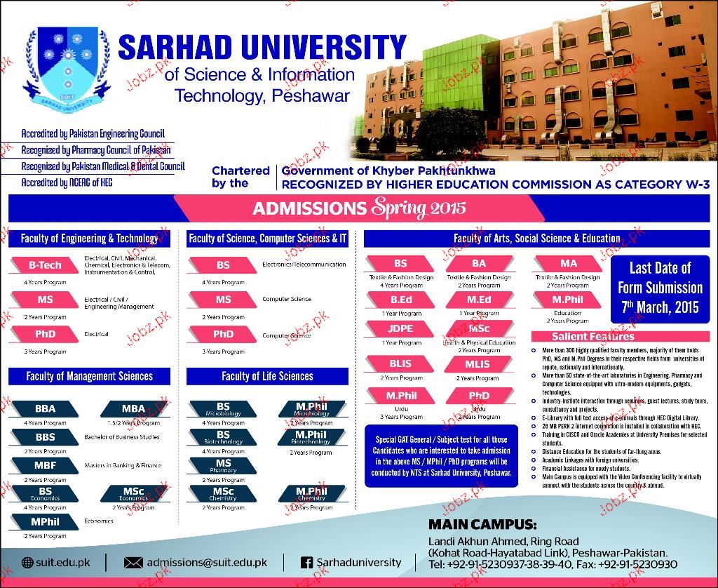 Sarhad University of Science & Information Technology Admission in MBA, BS, MS, MSc, B.Ed and Mphill in Peshawar. Read newspaper ad for exact details.