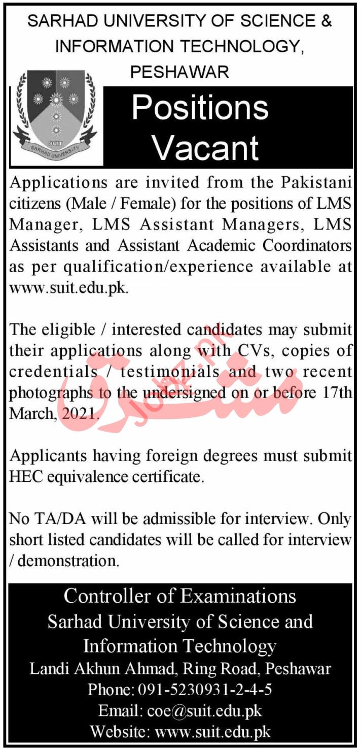 Latest Sarhad University of Science & Information Technology Teaching Posts Peshawar 2025